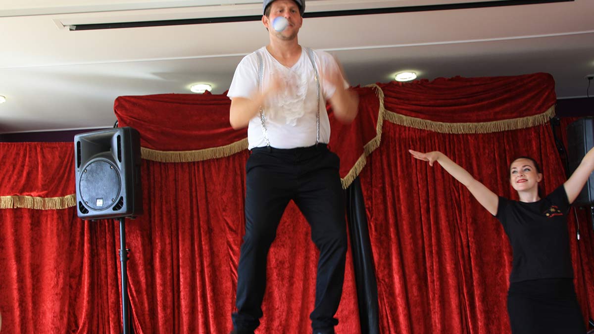Dabei lieferten die Artisten nicht nur ein unterhaltsames und lustiges Rahmenprogramm mit Jonglieren, einer Hula-Hoop-Show sondern auch einer spannenden Showeinlage mit Messerwerfen. Besondere Aufmerksamkeit zogen jedoch die beiden heimlichen Starakteure Hund Rocco und Bounty auf sich, von denen die Bewohner/-innen im besonderen Maße begeistert waren. Für die Showeinlagen durfte traditionelle alte Zirkusmusik und phantasievollen bunte Kostüme natürlich nicht fehlen.