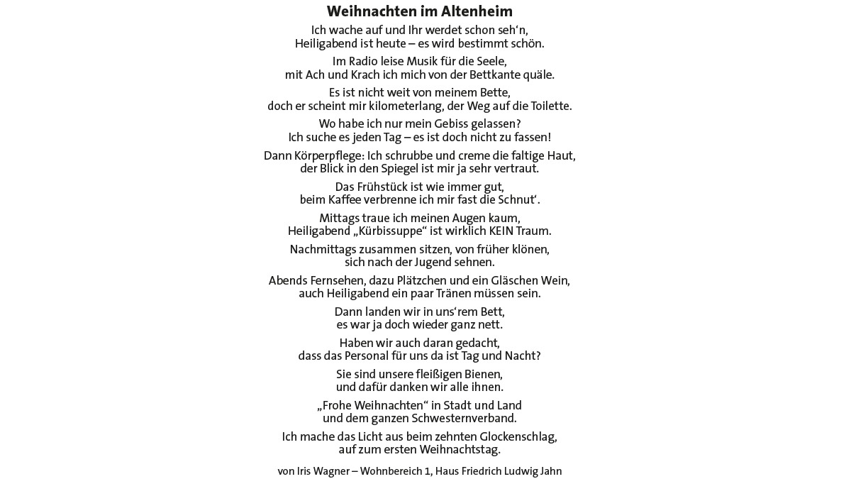 Iris Wagner aus dem „Haus Friedrich Ludwig Jahn“ hat ein wirklich tolles Weihnachtsgedicht geschrieben, dass wir der Öffentlichkeit auf keinen Fall vorenthalten möchten. Im Vergleich zu vielen anderen Weihnachtsgedichten setzt die Bewohnerin der Einrichtung dabei nicht auf den typischen Harmonie- und Gefühlskitsch, sondern ist in ihrem Werk erfrischend ehrlich. Auch Iris Wagner feiert gerne das Weihnachtsfest, doch in ihrem Gedicht weist sie auch auf die nicht so schönen Aspekte des Älterwerdens hin, und dass diese auch zur Weihnachtszeit leider nicht verborgen bleiben. Doch weiter lehrt sie uns durch ihre Verse, dass wir uns genau deshalb auf die positiven Dinge des Lebens konzentrieren sollen, insbesondere auf die Menschen, die uns in schweren Zeiten unterstützen. Aber genug der Worte. All das könnt ihr in Iris Wagners Gedicht selbst nachlesen.