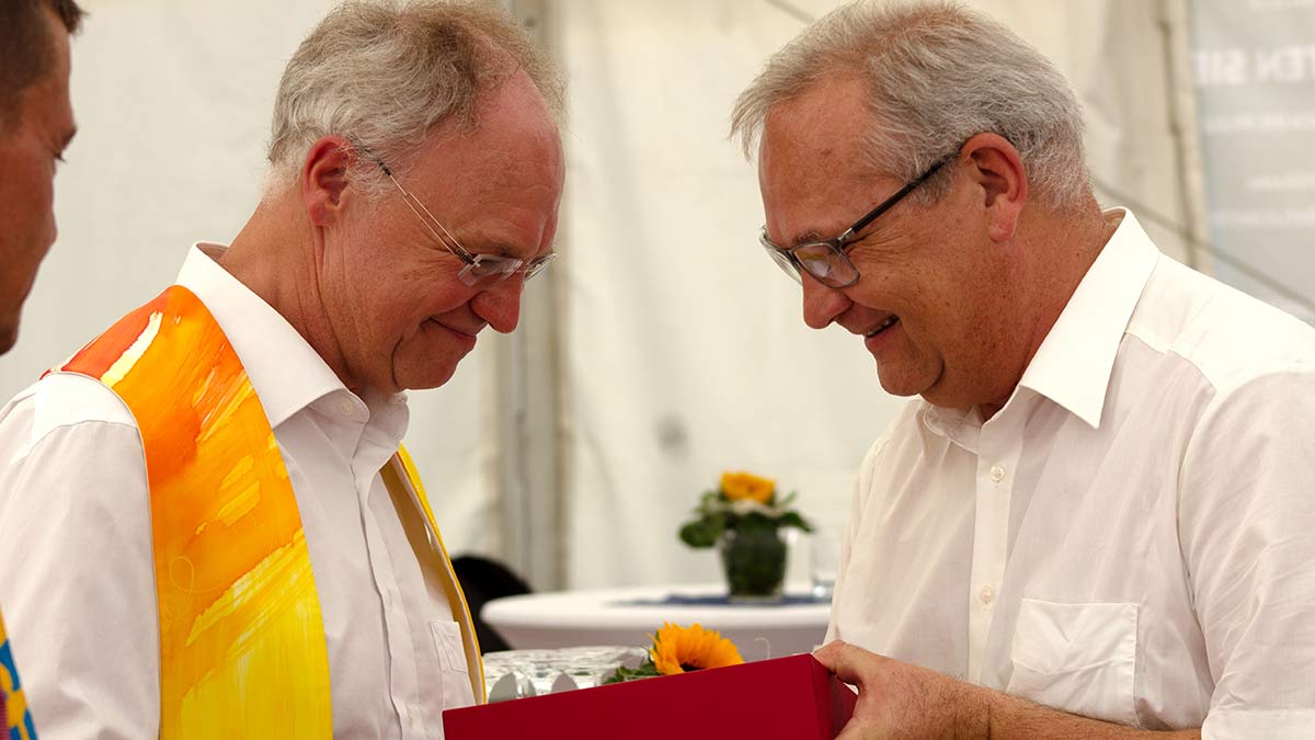 Zum Abschluss gab es einen beeindruckenden Wortgottesdienst, in dessen Mittelpunkt das Leben und Wirken Dietrich Bonhoeffers stand. Pfarrer Jürgen Schindler und Christoph Lauter weihten im Anschluss gemeinsam mit Diakon Elmar Kern feierlich das neue Pflegeheim ein. Als Geschenk brachten sie eine Bibel für den neuen Andachtsraum mit.