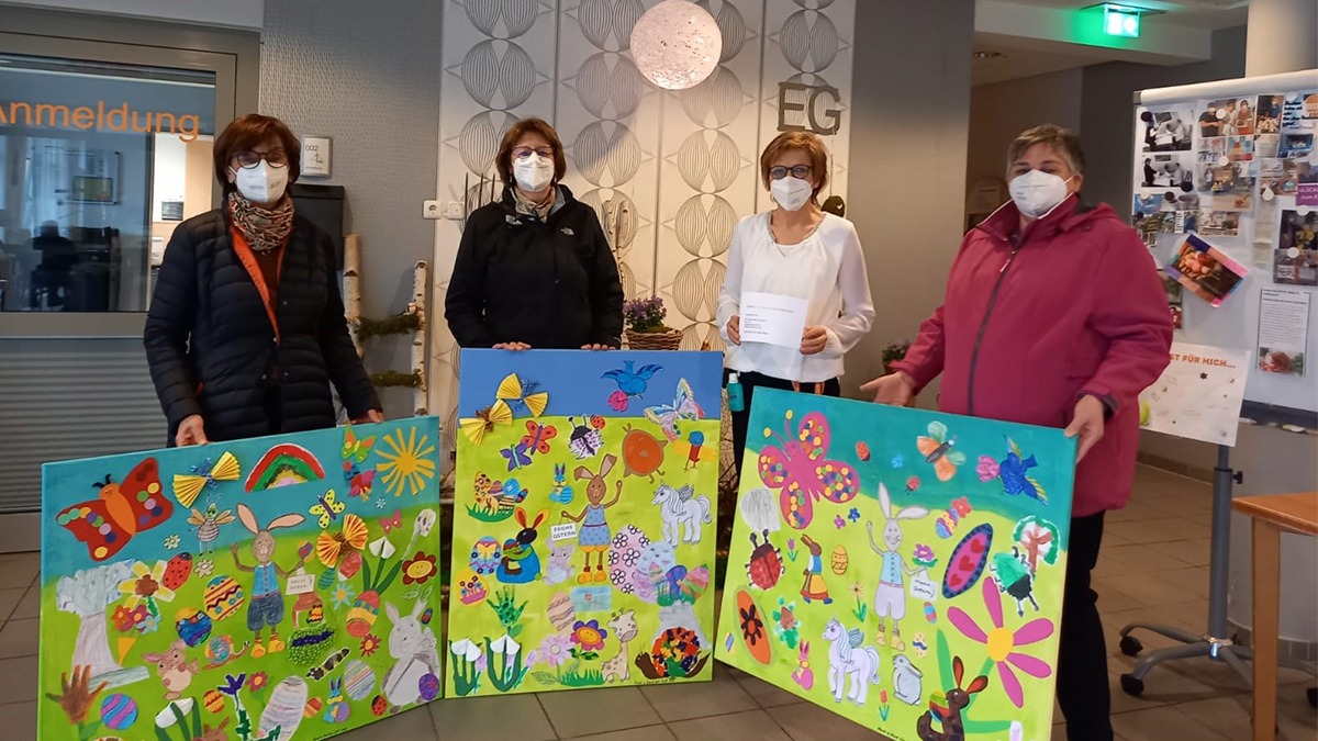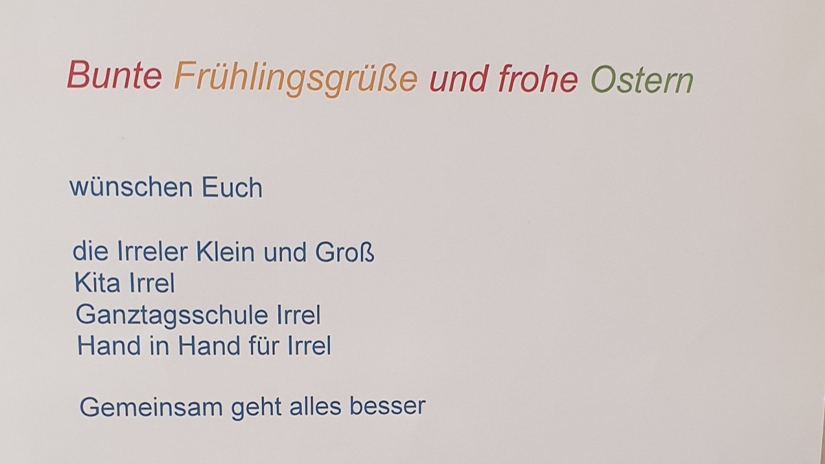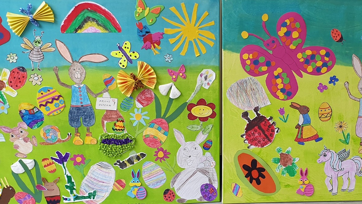 Die Initiative „Hand in Hand für Irrel“ hatte einen Aufruf gestartet, dass alle Kinder wunderschöne Osterbilder gestalten können, die dann zu einer Collage zusammengestellt werden. Die Resonanz auf diese Aktion war so groß, dass für das „Haus St. Ambrosius“ drei große Leinwände mit den schönsten Bildern hergestellt werden konnten. Das ist doch mal wirklich eine schöne Geste und eine tolle Osterdeko! Vielen lieben Dank für die Mühe.