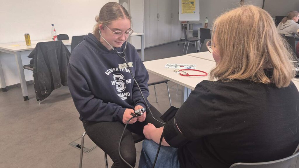 Wie fühlt es sich an, anderen Menschen die Teilhabe an der Gesellschaft zu erleichtern? Genau diese Frage haben die Heilerziehungspflege-Azubis der „Akademie“ des Schwesternverbandes jungen Menschen beantwortet. Sie veranstalteten im Schulgebäude im Jägermeisterpfad einen Informationstag für die Schüler*innen der Gemeinschaftsschule Neunkirchen Stadtmitte. Mit dem Ziel, die Schüler*innen für die Pflege zu begeistern. Sie gaben den interessierten Besucher*innen Einblicke in die Aufgaben und Einsatzbereiche der Heilerziehungspflege, standen mit Rat und Tat sowie für Fragen bereit. Sie zeigten, in Theorie und Praxis die Kunst der richtigen Handdesinfektion oder zeigten wie etwa der Blutdruck gemessen wird. Langweilig und zu theoretisch wurde es nicht. Bei einem Rollstuhlparcours und mit einem Alterssimulationsanzug sowie einer Simulationsbrille konnten die Schüler*innen praktisch testen, wie es sich anfühlt, beeinträchtigt zu sein und wie sinnerfüllend es sein kann, hier zu helfen. Ein toller ereignisreicher und informativer Tag, nicht nur für die Schüler*innen der Gemeinschaftsschule, sondern auch für die Auszubildenden.