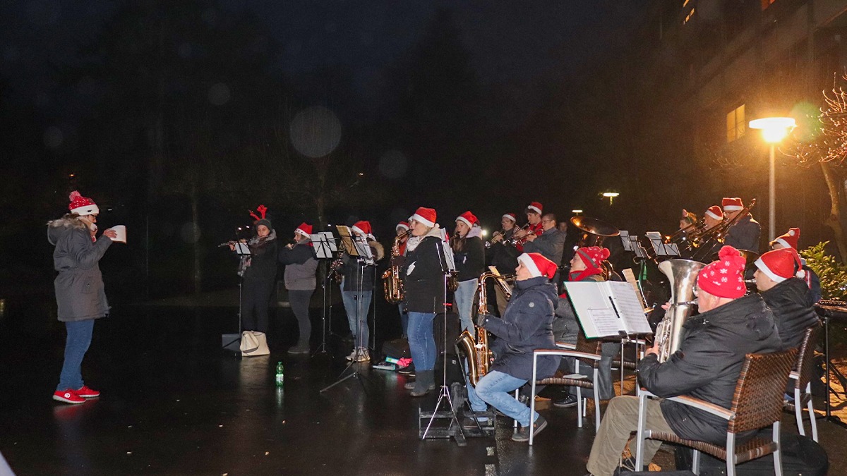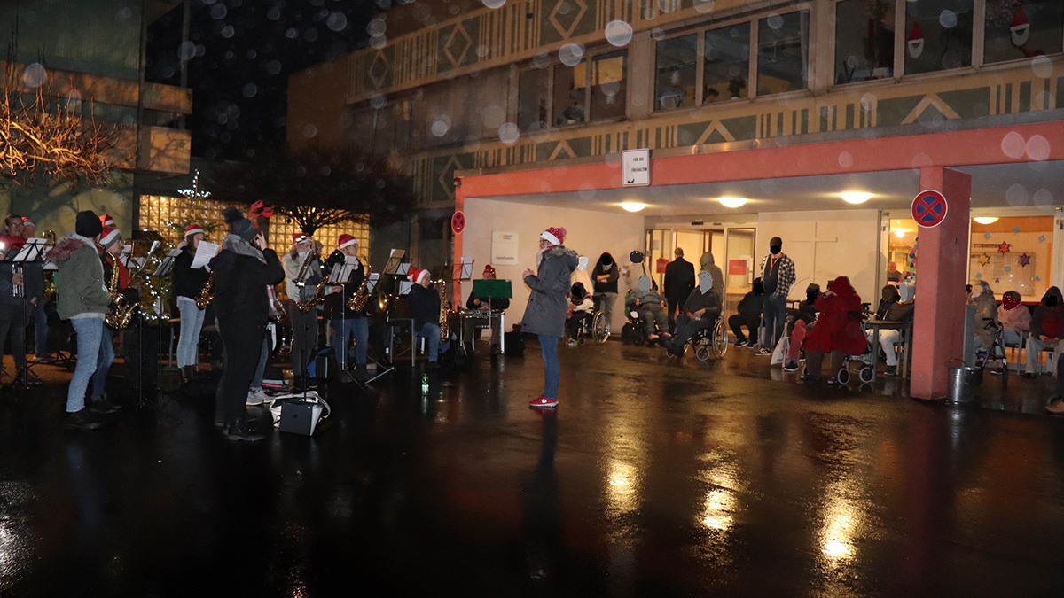 Wenn da nicht beispielsweise Saskia Philipps, Pflegefachkraft auf der Wohngruppe B2, gewesen wäre. Als stellvertretende Schriftführerin im „Musikverein Hubertus 1901 e.V.“ Mettlach-Weiten hatte sie eine schöne Idee: Sie konnte ihre Mitmusikant*innen dafür gewinnen, sich kurzfristig am Sonntagabend, 12. Dezember, zu einem weihnachtlichen Konzert auf dem Vorplatz der „Laurentiushöhe“ zu versammeln. Trotz Nieselregens hatten sich dort etwa 40 Bewohner*innen eingefunden – und beim Klang weihnachtlicher Melodien kam auch die entsprechende Stimmung auf. Rund eine Dreiviertelstunde wurde zu bekannten deutschen („O du fröhliche“), englischen („The herald angels sing“) und auch amerikanischen („White Christmas“) Weihnachtsklassikern mitgeklatscht – und manchmal sogar mitgesungen.